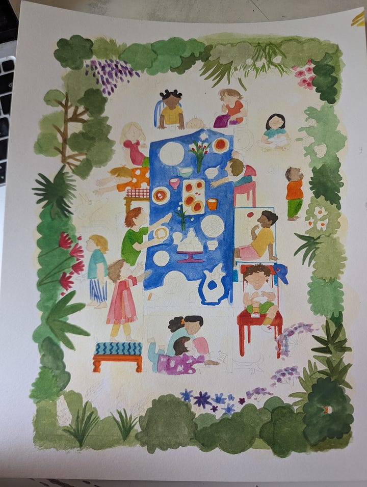 Above you can see Rukmini’s two daughters (on the stool in pink and under the table in purple) as well as my nephew smelling the flowers. When drawing lots of characters I love to include some real life people.