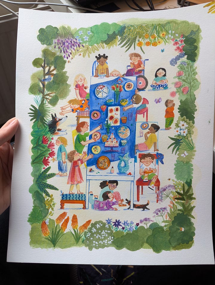 Next up I went to the studio and drew out a rough image. Rukmini wanted a children’s summer garden party which showed the food but didn’t focus on it (there’d be photos in the finished article). Instead the focus was on children having fun outside and the joys of an English garden in summer time.